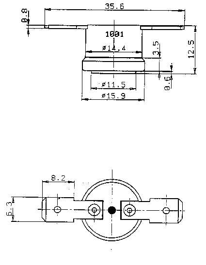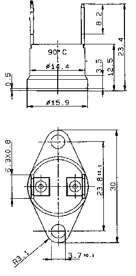 | Ingombri e geometria termostato mod. 261, faston verticali | Ingombri e geometria termostato mod. 261, faston orizzontali |